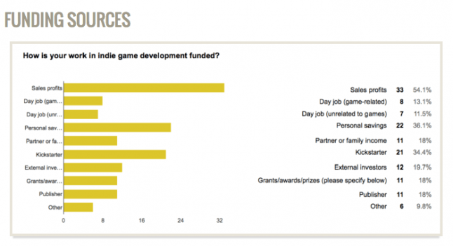 According to the results of an anonymous survey, which collected data from Indie Megabooth exhibitors, the most common forms of funding are sales profits from previous games, Kickstarter, and personal savings.